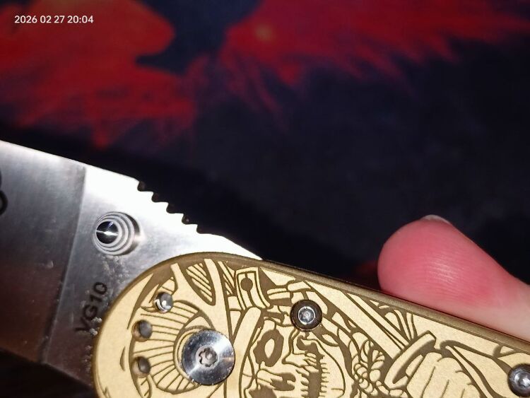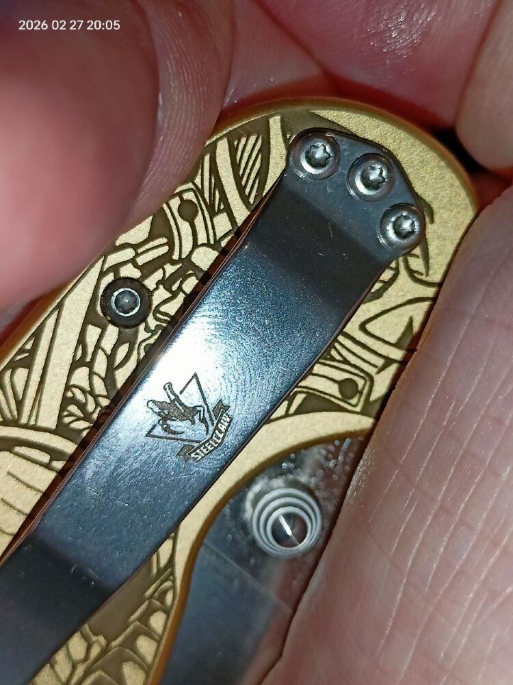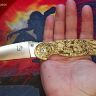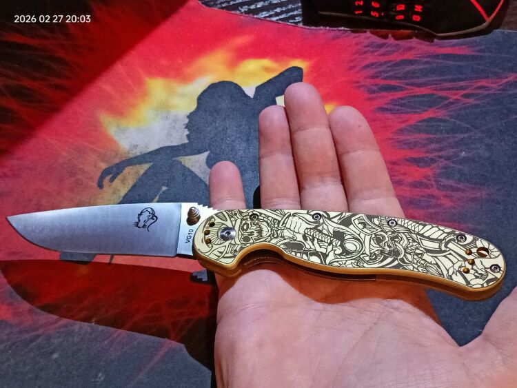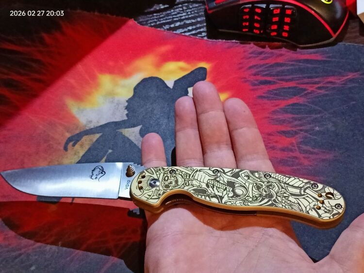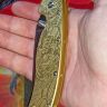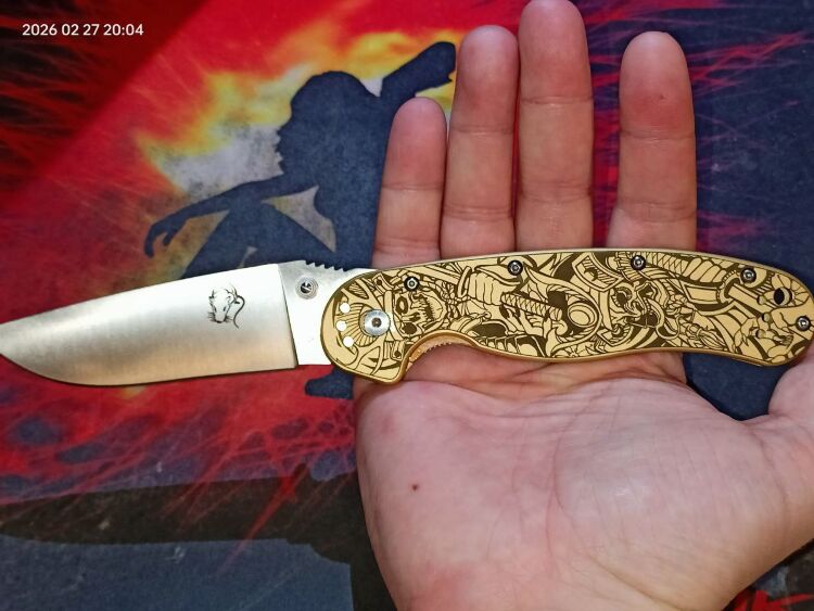 Рукоять выполнена из латуни, что придает ножу приятную тяжесть и солидность. Золотистый цвет металла идеально сочетается с тематикой гравировки. Латунь является живым материалом, который со временем приобретает благородную патину, подчеркивая винтажный характер изделия. Эргономичная форма рукояти гарантирует комфортный хват при любой работе. Для удобства ношения нож оснащен переставляемой клипсой.