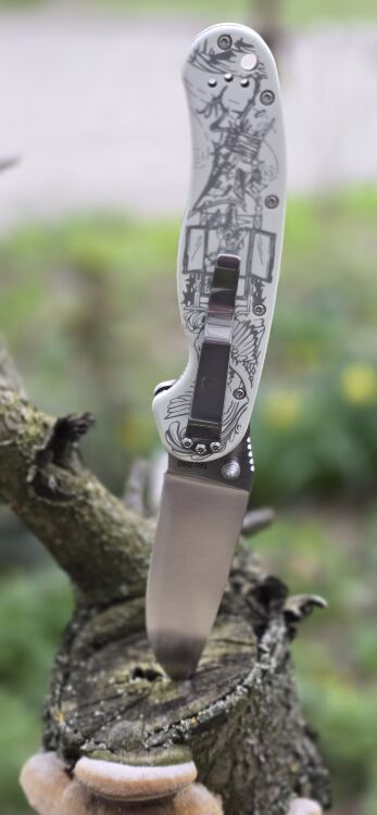 Рукоять выполнена из белоснежного стеклотекстолита G10. Этот материал не боится влаги, перепадов температур и ударных нагрузок. Белый цвет делает нож визуально легким и нарядным, а также позволяет легко найти его в траве или рюкзаке. Текстурированная поверхность накладок предотвращает скольжение в руке. Нож оснащен переставляемой клипсой для удобного ношения.