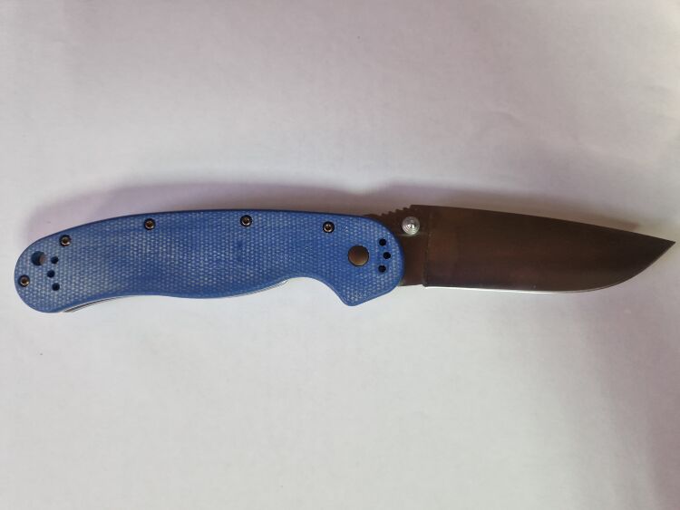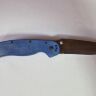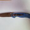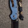 Рукоять выполнена из синей микарты — композитного материала на основе ткани и полимерной связки. В отличие от пластика или G10, микарта ощущается в руке теплой и бархатистой, а при намокании не скользит, а наоборот, становится более цепкой. Глубокий синий цвет и характерная тканевая фактура придают ножу уникальный, запоминающийся вид. Эргономика рукояти безупречна: выраженная подпальцевая выемка обеспечивает надежный хват и безопасность. Нож оснащен переставляемой стальной клипсой, которую можно закрепить в любом из четырех положений, а также имеет темлячное отверстие для персонализации.