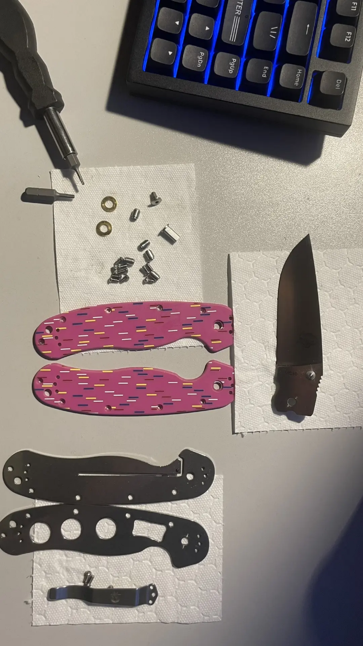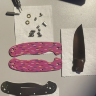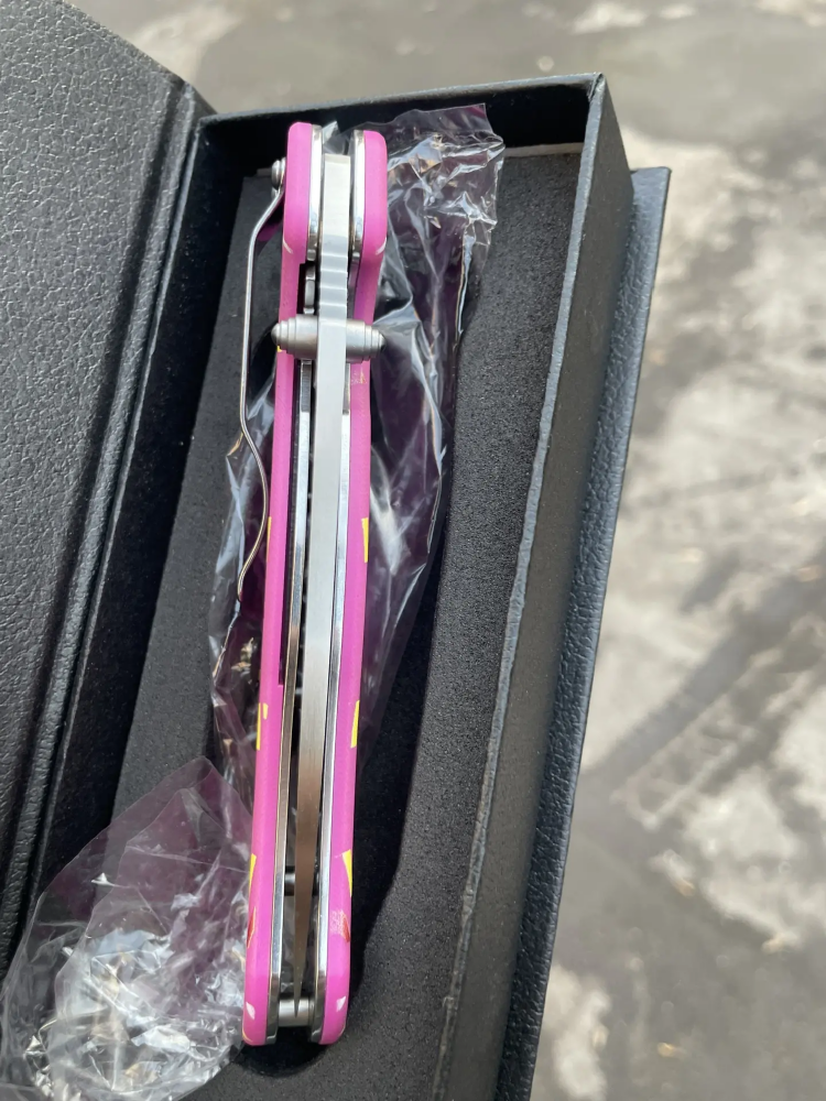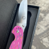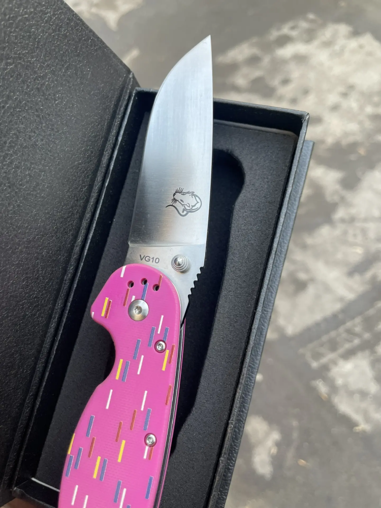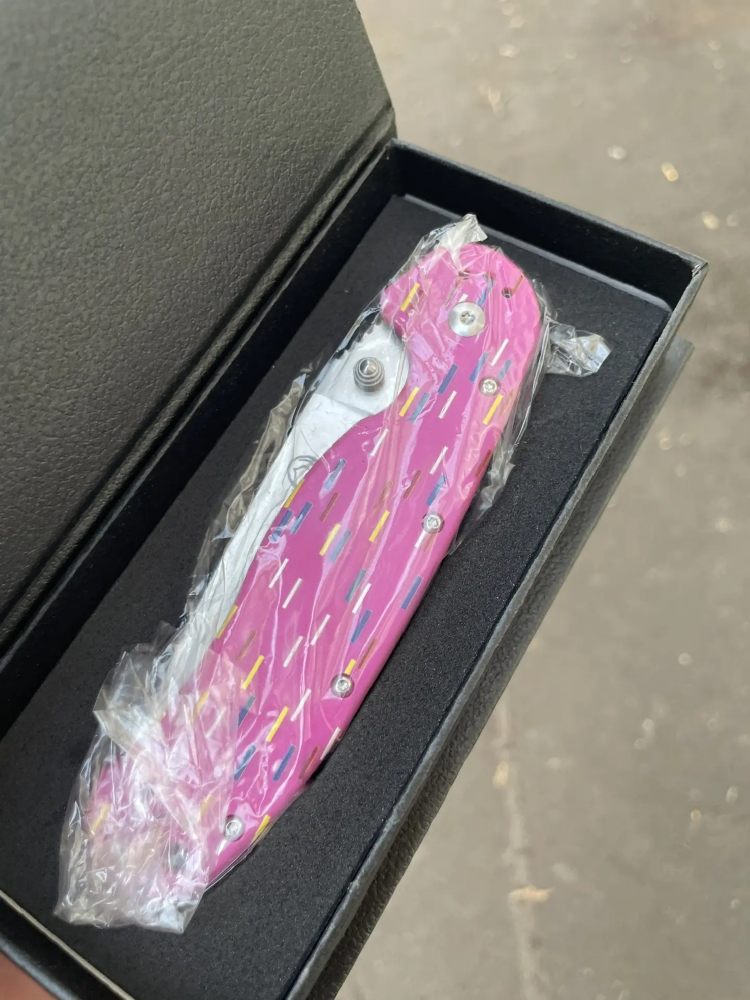 Рукоять изготовлена из прочного стеклотекстолита G10 розового цвета с разноцветным узором, имитирующим кондитерскую посыпку. Материал не скользит в руке, устойчив к влаге и ударам. Яркая внешность делает нож «дружелюбным» для окружающих, снижая градус напряженности при его использовании в людных местах. Для удобного ношения предусмотрена переставляемая клипса.