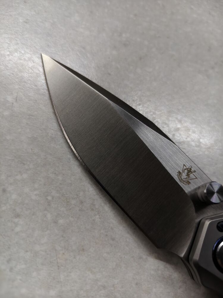 Клинок выполнен в форме drop-point, что обеспечивает универсальность и легкость в работе. Используемая японская сталь VG-10 славится высокой прочностью, коррозионной стойкостью и хорошим удержанием остроты. Сатиновая обработка поверхности придаёт клинку матовый блеск. Высокие спуски способствуют отличным режущим характеристикам, а рифление на обухе улучшает контроль при работе. Нож легко раскрывается при помощи шпенька, а надежный замок frame-lock фиксирует клинок, предотвращая случайное складывание.