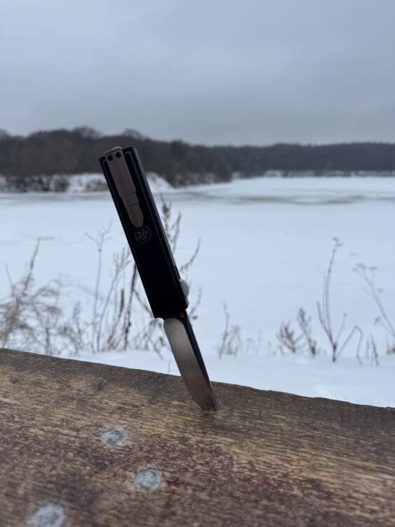 Клинок выполнен из инструментальной стали D2 — популярного и проверенного материала с отличной твёрдостью и высокой износостойкостью. Эта сталь хорошо держит заточку, устойчива к выкрашиванию режущей кромки и подходит как для грубой работы, так и для точных резов. Из минусов — средняя коррозионная стойкость, поэтому стоит избегать длительного контакта с влагой. Форма клинка — drop point, универсальная и эффективная в различных задачах. Запуск и возврат клинка осуществляется за счёт надёжного фронтального OTF-механизма с пружиной, активируемого ползунком на корпусе.
