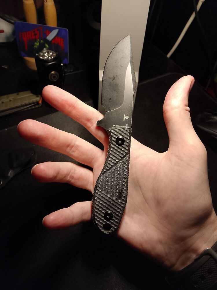 Клинок выполнен в классической форме drop-point с характерной drop point формой, что обеспечивает превосходную режущую способность и точность реза. Сталь клинка — D2, которая отличается отличной износостойкостью и долго сохраняет остроту режущей кромки, а обработка blackwash не только улучшает его внешний вид, но и скрывает мелкие царапины. Фиксированная конструкция обеспечивает максимальную надежность и исключает любые механические поломки, характерные для складных ножей.