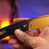 Клинок формы drop-point — классическая, сбалансированная форма с чуть опущенной кромкой, удобной для общего использования:. Сталь T14N обладает хорошей твёрдостью и сравнительной устойчивостью к износу, а PVD-покрытие золотого цвета обеспечивает дополнительную защиту от коррозии и придаёт ножу особый шарм. Раскрывается клинок через дол или через флиппер — оба метода удобны и позволяют быструю работу одной рукой. Фиксация осуществляется при помощи frame-lock.