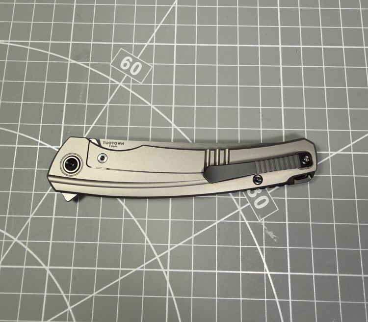 Рукоять изготовлена из титана — прочного, лёгкого и абсолютно устойчивого к коррозии материала. Поверхность имеет выразительную текстуру, хорошо ощущается в руке и подчёркивает премиальный характер ножа. Форма рукояти плавная и эргономичная, с акцентом на комфорт при длительном удержании. Для удобства повседневного ношения предусмотрена аккуратная клипса, позволяющая фиксировать нож на кармане или снаряжении.