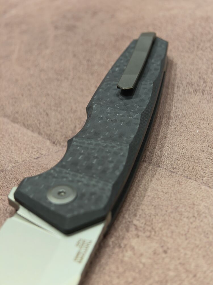 Рукоять ножа изготовлена из ламината, сочетающего G10 и карбон, что придает ей исключительную прочность и износостойкость. Эргономичная форма рукояти обеспечивает комфортное удержание даже при длительной работе. Текстура поверхности способствует надежному хвату, предотвращая скольжение. Для удобного ношения нож оснащен карманной клипсой, позволяющей закрепить его на одежде или рюкзаке.