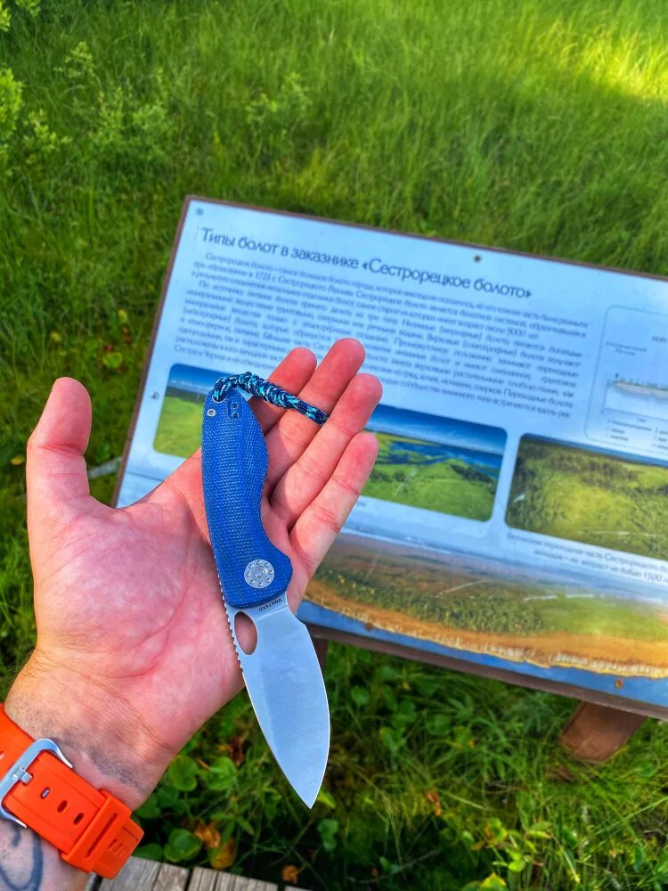 Рукоять ножа изготовлена из синей микарты, что придает конструкции прочность и легкость. Микарта — это композитный материал, состоящий из слоев ткани, пропитанных смолой и спрессованных под высоким давлением. Этот материал отличается высокой устойчивостью к механическим повреждениям и воздействию химических веществ, обеспечивая надежный и комфортный хват. Синий цвет микарты придает ножу уникальный и привлекательный внешний вид. Нож оснащен клипсой и темлячным отверстием.