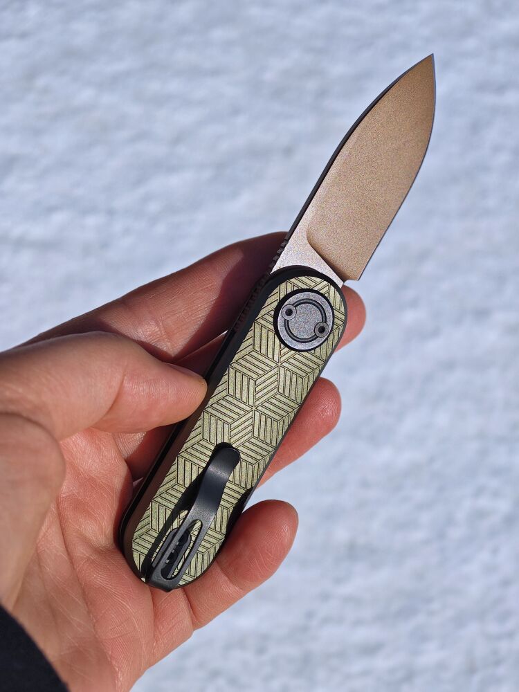 Рукоять ножа выполнена из алюминия, что придает ему элегантный минималистичный вид, обеспечивая при этом прочность и лёгкость. Для удобного ношения в кармане предусмотрена карманная клипса.