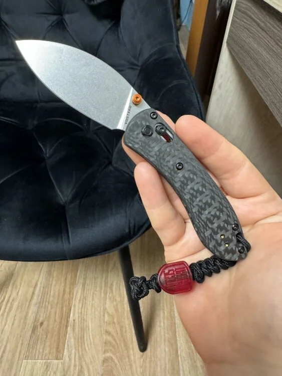 Материал рукояти ножа — Carbon Fiber . Carbon fiber — углеволокно применяемое в различных сферах промышленности, в том числе и при создании рукоятей для ножей. Карбон это довольно дорогой, но невероятно прочный материал. Он очень легок и не боится влияния химических реагентов. Переплетения карбоновых нитей, вырисовывают уникальную текстуру, поэтому карбон прочно обосновался в сегменте аксессуарных и джентльменских ножей. Стоит отметить, что несмотря на то, что карбоновые нити почти не возможно порвать, этот материал плохо переносит удары, а так же прямое воздействие солнечных лучей.
