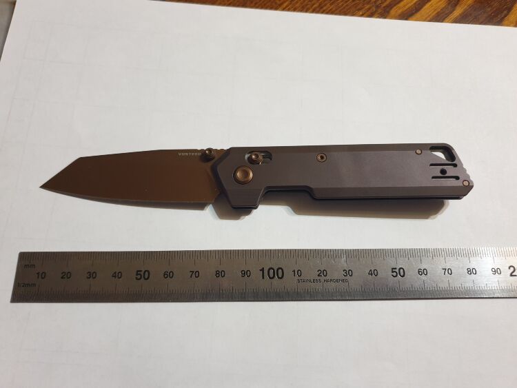Клинок ножа выполнен в форме обратного танто, что придает ему универсальность и стойкость к нагрузкам. Материал клинка – сталь S35VN, она хорошо поддаётся полировке, имеет высокую ударную вязкость, хорошо держит заточку и сопротивляется коррозии. Несмотря на высокий уровень твёрдости, S35VN не теряет в прочности. Поверхность клинка имеет покрытие медного цвета, которое придаёт ножу стильный и необычный вид. Для удобства удержания на обухе есть рифление, обеспечивающее уверенный упор для большого пальца. Механизм открытия клинка представляет собой шпенёк, который обеспечивает легкий и быстрый доступ к клинку. Благодаря керамическим шарикоподшипникам с сепаратором, ход клинка плавный и быстрый, а за его надежную фиксацию отвечает механизм crossbar-lock, известный своей долговечностью и безопасностью.