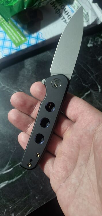Рукоять изготовлена из титана — материала, имеющего превосходные механические свойства. Он достаточно прочный, жёсткий и обладает небольшим весом в сравнении с другими популярными металлами, использующимися в рукоятях ножей. Рукоять из титанового сплава жаропрочна, физически инертна и не подвержена окислению. Внешне титановые рукояти выглядят роскошно и идеально дополняют сталь клинка любой марки. Несмотря на сложную степень обработки, большую вязкость и высокую стоимость, этот материал всё равно довольно распространен среди ножеделов.