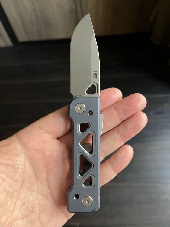 Для начала - несмотря на все эти отверстия, это на удивление увесистый брусок металла - 109 г.. Нож ощущается очень крепким, сбитым и вес только добавляет этих ощущений. Если бы он весил грамм 75, а я думаю We вполне могли бы это сделать, нож воспринимался бы как некая игрушка и впечатление было бы совсем не то.