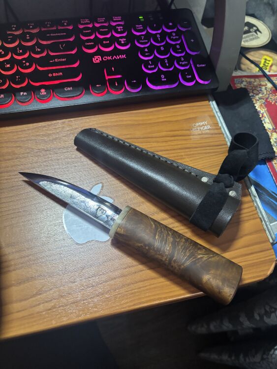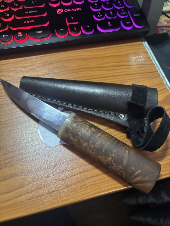 Рукоять выполнена в традиционном якутском стиле из капа берёзы — благородного и красивого материала с уникальным рисунком. Её овальная, почти яйцевидная форма обеспечивает удобный, уверенный хват в любых условиях, а отсутствие гарды и выступов соответствует каноничной конструкции: ничего лишнего, только то, что действительно нужно. Такая форма особенно хорошо работает при длительной резке, позволяя пальцам естественно лечь вдоль рукояти.