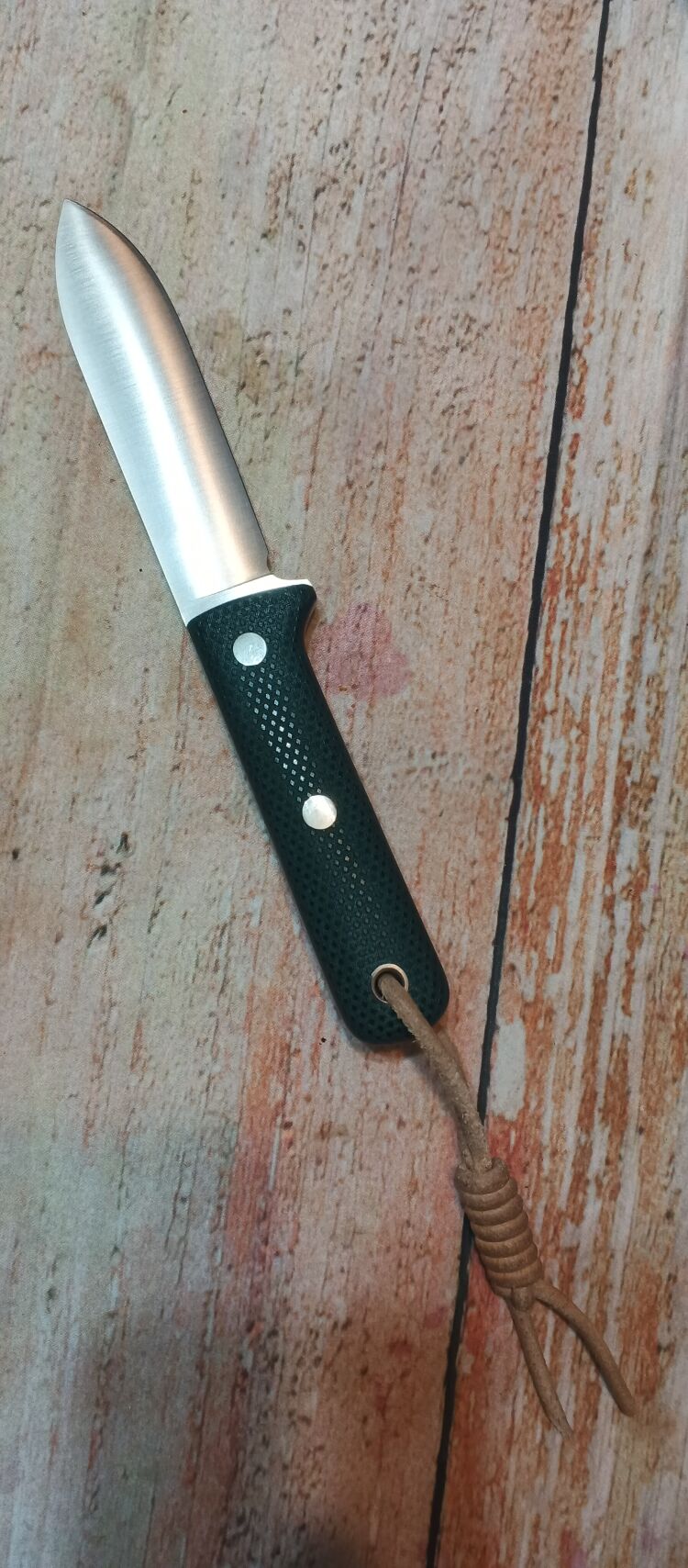 Рукоять выполнена из микарты — это высокодекоративный конструкционный композитный материал, представляющий собой слоистый пластик на основе ткани или бумаги и полимерного связующего вещества (синтетической смолы). Микарта прочная, нескользкая, не впитывает запахи и комфортная для руки. Кроме того, материал красив, долговечен, хорошо переносит значительные перепады температуры, не вступает в реакцию со многими химическими веществами и имеет широкую цветовую гамму. Эти качества делают его более востребованным в ножевой индустрии, чем обычный пластик или дерево.