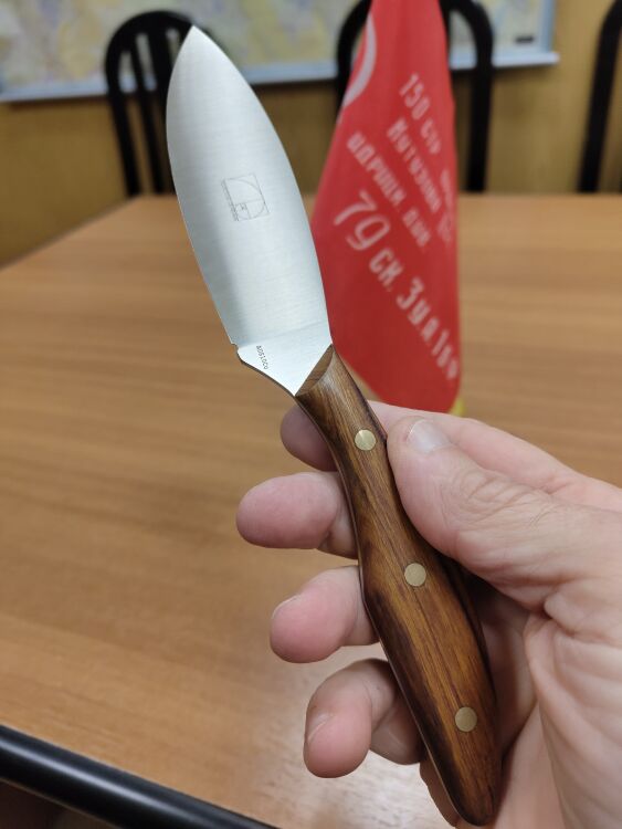 Конструкция рукояти — фултанг, что повышает общую жёсткость и надёжность ножа. Накладки выполнены из айронвуда — одной из самых плотных и износостойких пород древесины. Айронвуд устойчив к влаге, не боится перепадов температуры и со временем лишь выигрывает в глубине цвета. Классическая форма рукояти делает хват естественным и удобным, обеспечивая контроль как при аккуратных работах, так и при силовых движениях.